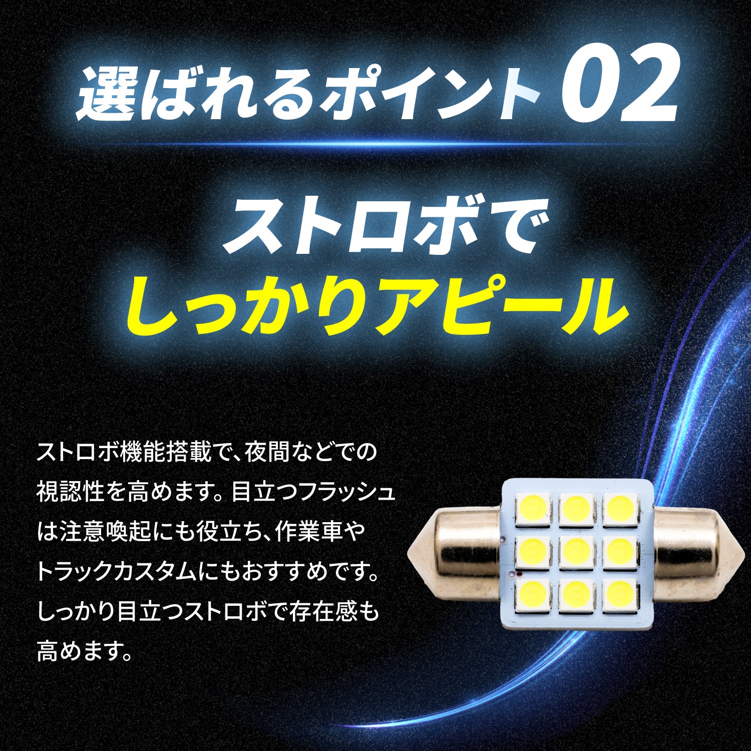 1つ目【圧倒的な明るさ・視認性】 高輝度LEDで夜間もはっきり目立つ明るさを実現。 周囲からの視認性を高め、作業中や夜間走行時も安心です。 トラックはもちろん、クレーンにも。プロの現場でも支持されています。 2つ目【ストロボでしっかりアピール】 ストロボ機能搭載で、夜間などでの視認性を高めます。 目立つフラッシュは注意喚起にも役立ち、作業車やトラックカスタムにもおすすめです。 しっかり目立つストロボで存在感も高めます。 3つ目【簡単交換でストロボ発光が可能】 バルブ内部に点滅パターンを内蔵しているため、リレーなどの追加部品は不要。 交換するだけでストロボ発光をお楽しみいただけます。 |