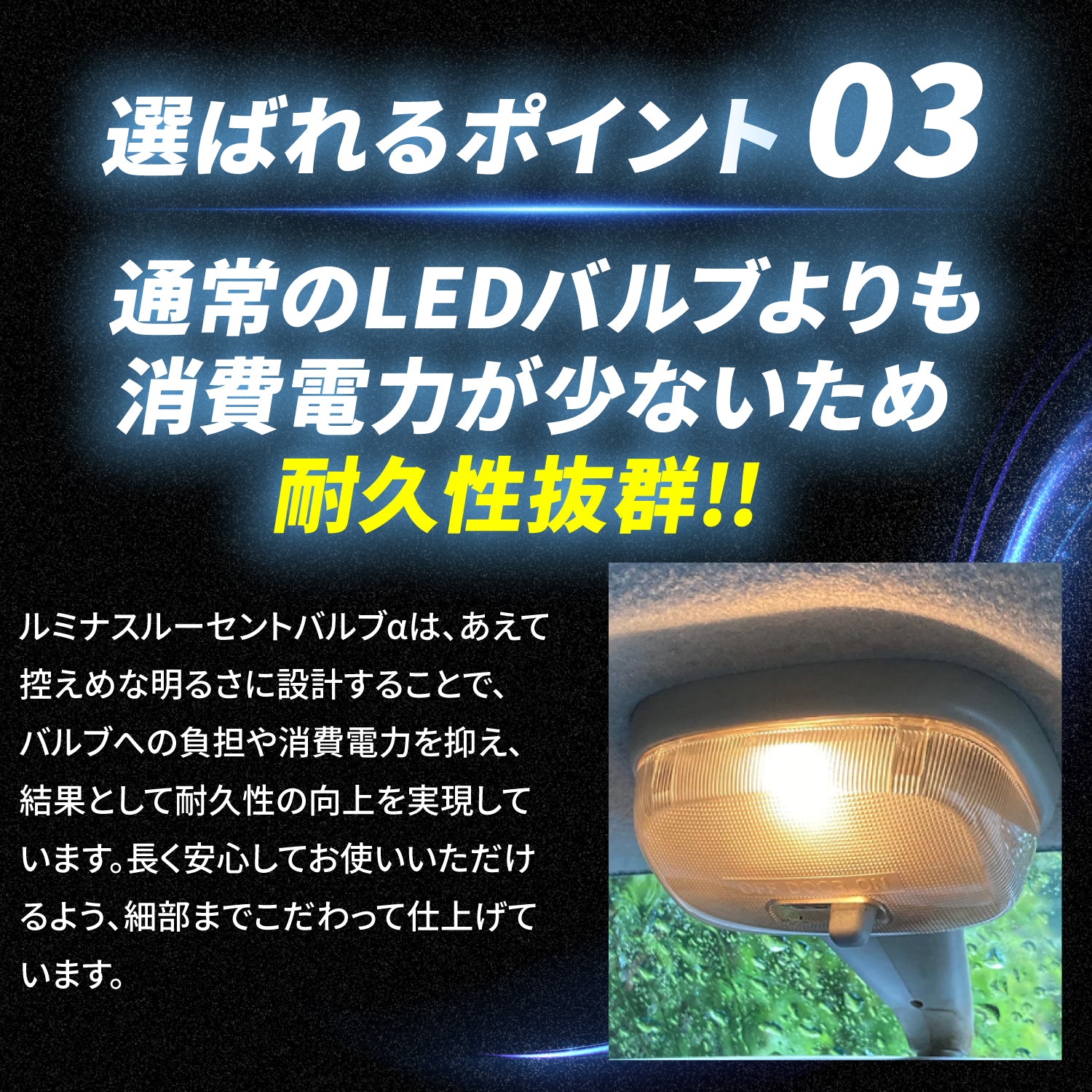 1つ目 【こだわり派・マニア層が本当に満足できる光】 LED電球に抵抗感がある方や、こだわり派・マニア層に向けて、“本当に満足できる光”を追求し、情熱を込めて開発しました。 LEDでありながら電球の優しい明るさを実現し、細部までこだわり抜いた品質が、こだわりの強い方にも選ばれています。 2つ目 【LEDに交換しているのが分からない】 LEDに交換しても「電球のような自然な明るさ」で、違和感なくご使用いただけます。 明るすぎず暗すぎない、絶妙な光量と色味が特長です。 特に旧車のオーナー様には大人気。 LED特有の眩しさが苦手な方や、昔ながらの温かい光を求める方にもおすすめです。 3つ目 【通常のLEDバルブよりも消費電力が少ないため耐久性抜群】 ルミナスルーセントバルブαは、あえて控えめな明るさに設計することで、バルブへの負担や消費電力を抑え、結果として耐久性の向上を実現しています。 長く安心してお使いいただけるよう、細部までこだわって仕上げています。 |